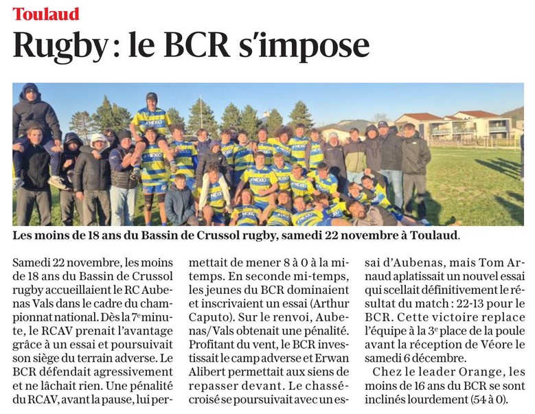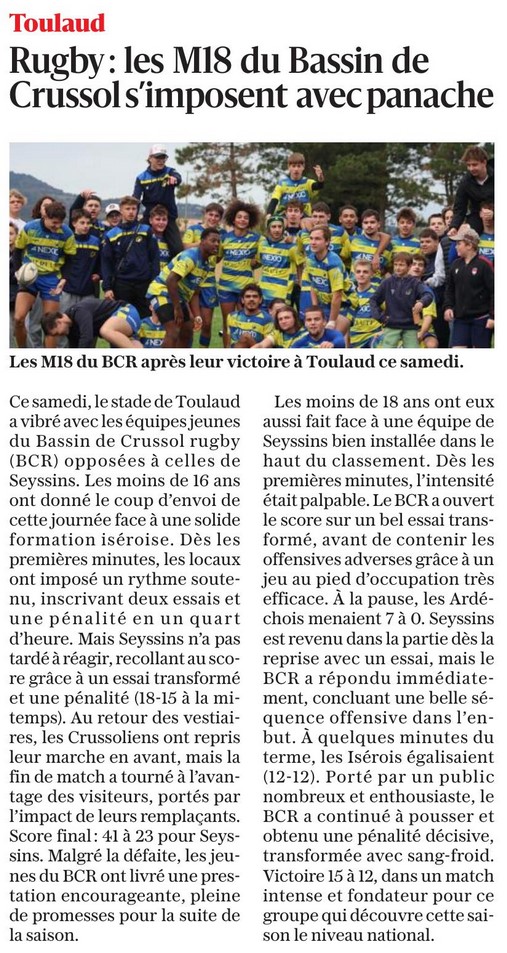 › 29/10 Rugby M18 du Bassin de Crussol s imposent avec panache