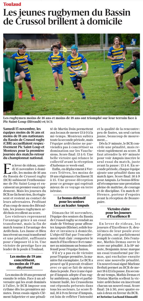› 19/11 Les jeunes rugbymen du Bassin de Crussol brillent a domicile